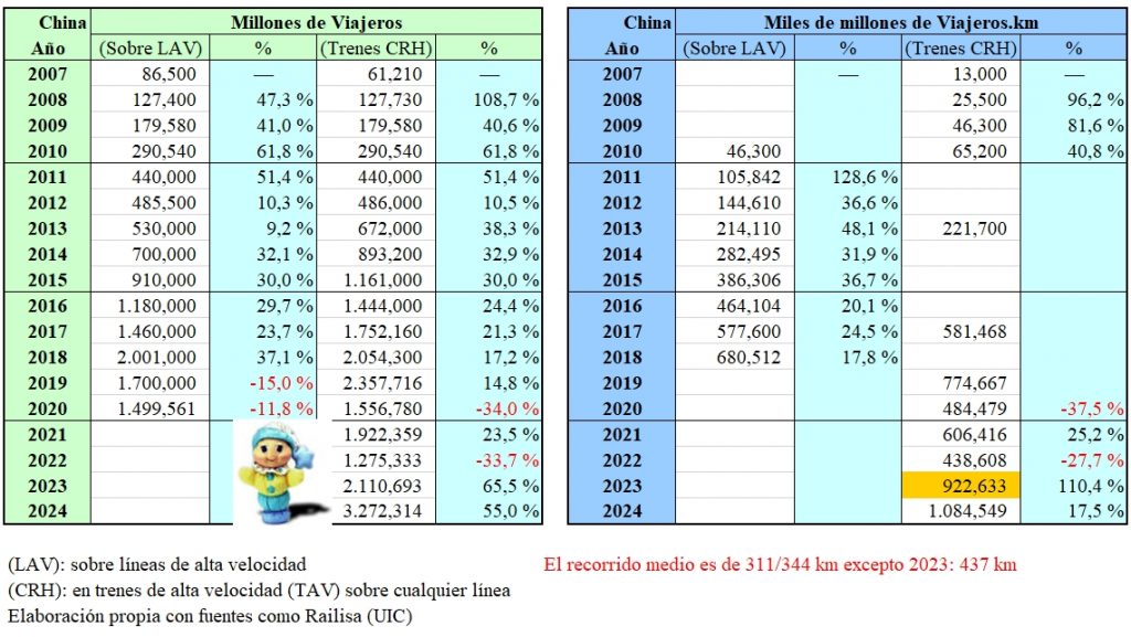 En un tiempo increíblemente corto (hasta el 31/12/2023) logró 44.944 km de LAV (21.074 para 350 km/h y 23.870 para 250), aparte de 850 km (el 31/12/2020) de LAV urbanas para conectar conurbaciones a 200 km/h, e innumerables líneas renovadas para 200 km/h y tráfico mixto (2.902 km a 31/12/2010; imposible imaginar los que hay ahora).