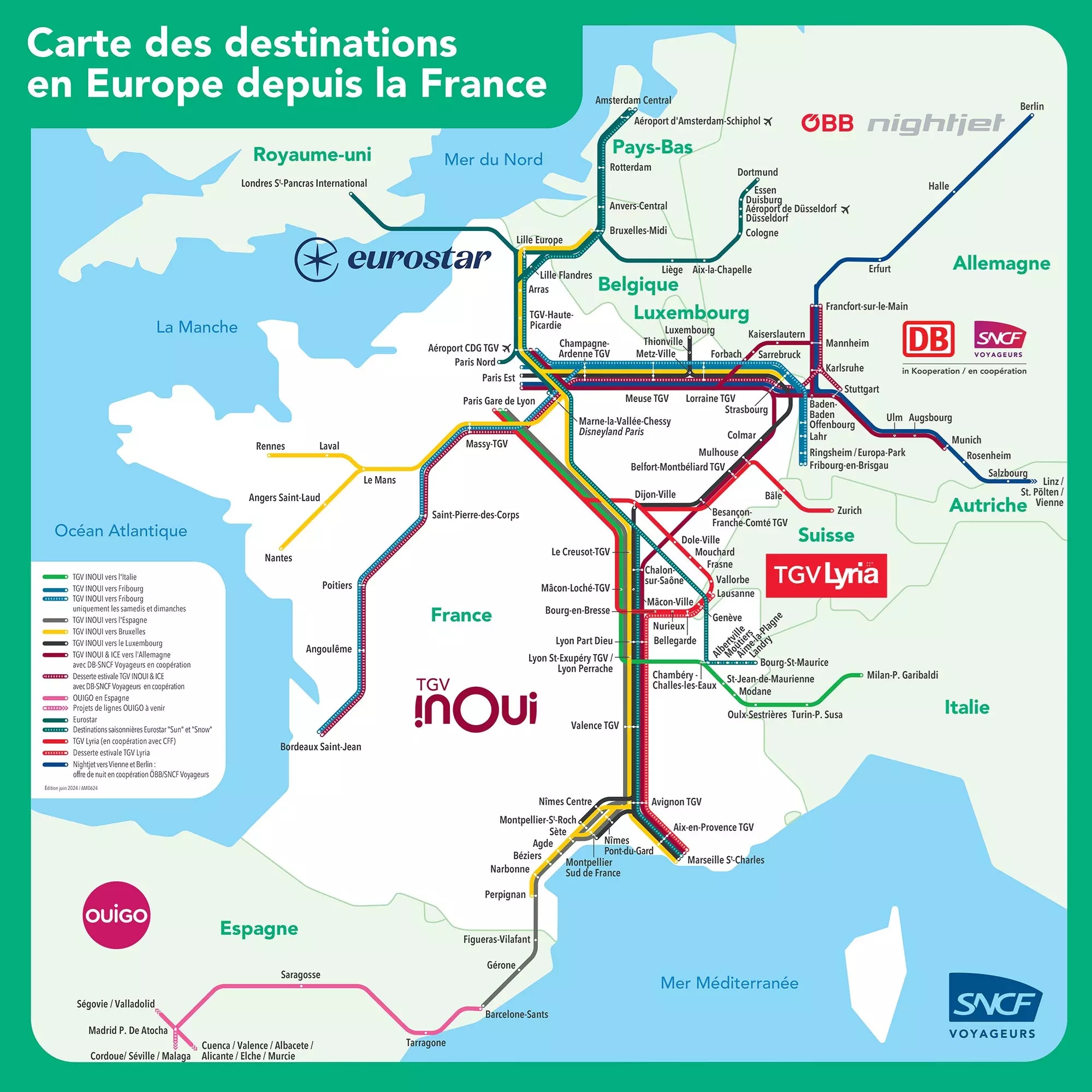 Además de sus recorridos por líneas convencionales francesas, tanto la UIC como SNCF cuentan a los TGV que hacen los servicios exAlleo (hasta Berlín, Fráncfort, Friburgo y Múnich), Eurostar (Londres, Ámsterdam y Colonia), Lyria (Ginebra, Lausana y Zúrich), Ouigo España, inOUI París-Barcelona y París-Bruselas, y SVI (a Milán). De esta forma muestran 61.647 M de vkm en 2024.