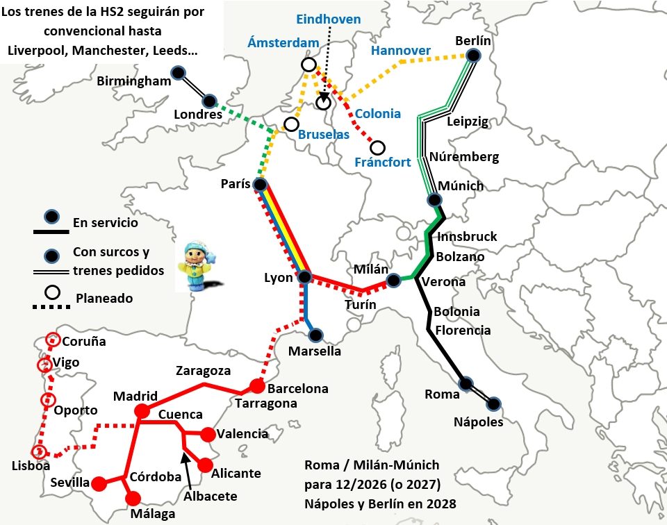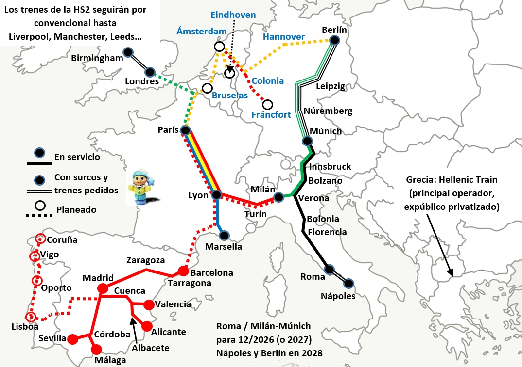 Dentro de su plan estratégico 2025 / 2029 (de nada menos que 100 mil millones, FS tuvo 16.529 M € de ingresos en 2024 por 4.122 del Grupo Renfe), en 05/2025 FS anunció servicios entre Italia, Austria y Alemania a partir de 12/2026, y los enmarcó dentro de una estrategia de expansión de los servicios de Trenitalia para crear una red por toda Europa.