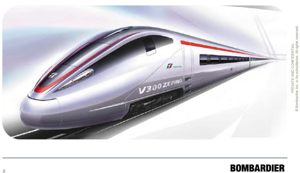 Para esta expansión necesitaban un tren “propio” y emblemático, y que cumpliese las ETI europeas. El elegido fue el V300Zefiro de Bombardier, que ganó el concurso internacional de Trenitalia de 2008 y fue diseñado por las plantas de Hennigsdorf (Berlín), Trápaga (Vizcaya, motores), Derby Litchurch Lane (Reino Unido, bogies) y Västerås (Suecia, sistemas eléctricos) y -el exterior- por la italiana Bertone.