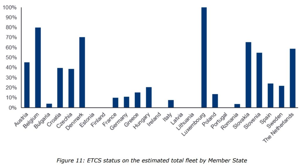 En 07/2023 la tasa de ERTMS en servicio en España era del 62%, muy por encima de Italia (42%), Polonia (34%) o Alemania (13%). Además, si se incluyen los km en construcción, el porcentaje español alcanzará el 90%.