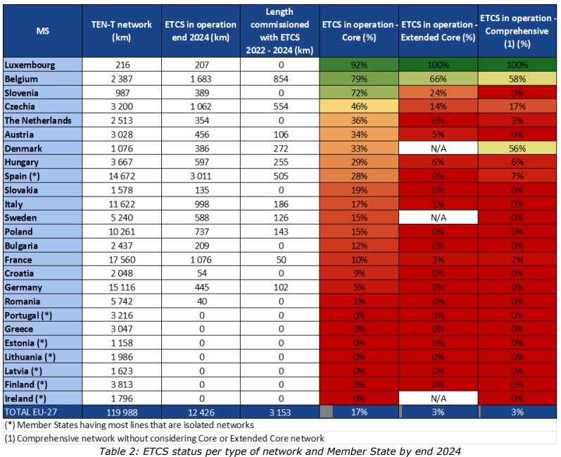 En 2016 solo 4.121 km de la Red Básica Europea tenían ERTMS, lo que suponía el 26% del objetivo del Plan de Despliegue Europeo (EDP) para 2023 (15.682 km). En 2017 era el 29% (4.500 km), en 2020 el 38% (5.959 km), en 2021 el 43% (6.713 km), en 02/2023 el 55% (8.600 km) y en 12/2024 el 80% (12.426 km).
