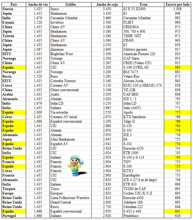 Recopilación propia -solo- del ancho máximo de los trenes (generalmente de alta velocidad) en el mundo, y de lo que sus cajas sobresalen de los carriles: