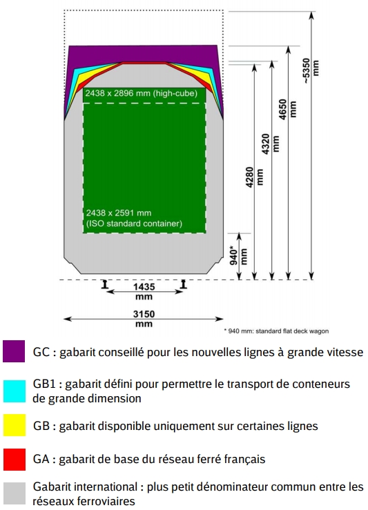 Así que el gálibo europeo (distinto para cada altura, por eso hay gálibo de partes bajas (andenes) y de partes altas (túneles), y también hay varios, en función de si son líneas para mercancías o para autopista ferroviaria) es el mínimo común europeo. Por ejemplo, los Euroduplex de Alstom (los de Ouigo) son algo más estrechos en su piso superior para poder cumplir las ETI, mientras que los Duplex (muy similares) solo cumplen el gálibo francés, ligeramente mayor, sobre todo en las partes altas.