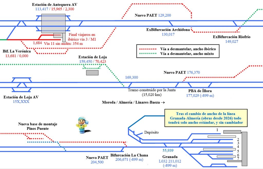 El inicio de la línea es el Nudo de Antequera(en azul con ancho estándar: 1.435 mm), mientras que el Nudo de Bobadilla (en rojo con ancho ibérico: 1.668 mm)hasta ahora era el más importante.