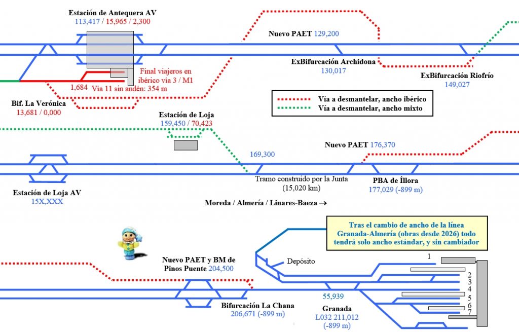 Al este del citado nudo queda la LAV a Granada. En trazado verde la línea con configuración de ancho mixto (dos anchos: estándar e ibérico)montada sobre la línea convencional y sobre un tramo de plataforma que construyó la Junta de Andalucía entre Loja y Tocón (12 km), para el fallido Eje Ferroviario Transversal de Andalucía.