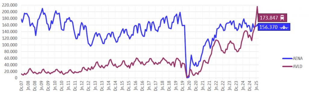 Como curiosidad, el tren de LD (Servicios Comerciales) solo había superado por poco al tráfico interior en avión (que incluye islas) entre 12/2013 y 05/2014 estando igualado hasta 03/2016 y volviendo a estar parejo (más en tren en invierno y menos en verano) desde 11/2023.