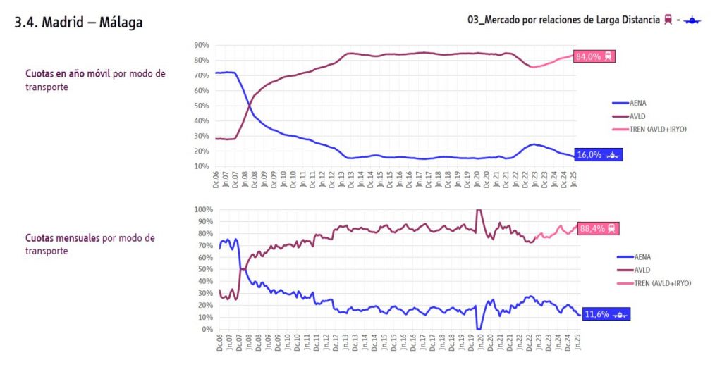 Madrid-Málaga ha sido el único corredor de AV donde descendió (del 84,8 al 82,0%) el % del ferrocarril entre 2019 y 2024 (Ouigo no empezó a operar hasta el 16/01/2025). Pero se debió a que el avión aumentó más (95%) que el tren, que lo hizo en un 58%.