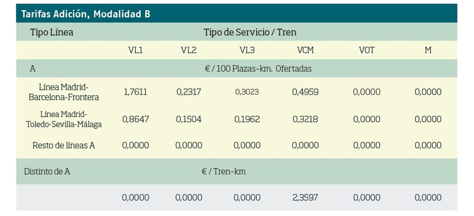 La Adición a la Modalidad A. Basado en el artículo 97.4 de la Ley del Sector Ferroviario (página 28). Penaliza a quienes no utilicen los surcos adjudicados y beneficia a los que pidan más surcos (trenes.km) de los concedidos, según el «tráfico objetivo». Se computa por meses. Ha bajado, y eso es bueno para los operadores, porque estaban reduciendo frecuencias sobre las asignadas (ya no, porque desde 2024 hacen más frecuencias de las asignadas, excepto Ouigo, que no llegó a Andalucía hasta el 16/01/2025):