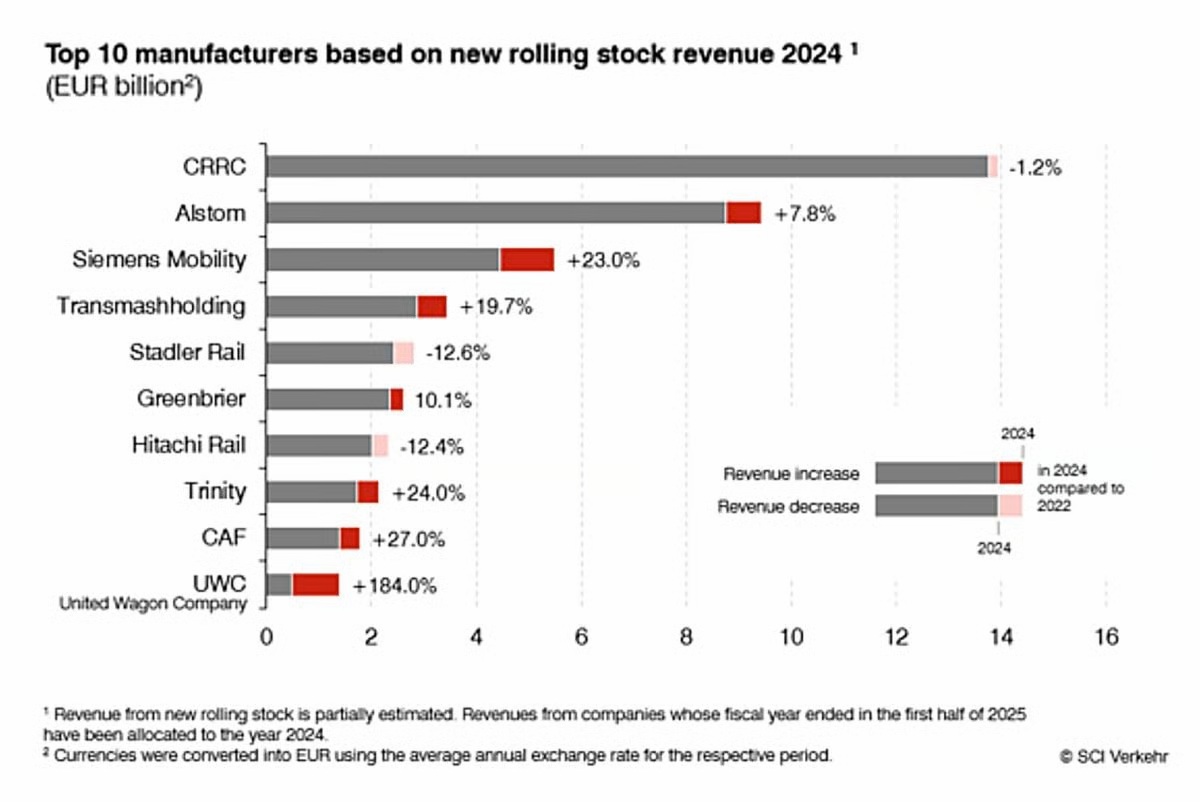 CRRC (China Railway Rolling Stock Co, fusión de CNR y CSR en 2015) es el fabricante de material ferroviario, una empresa independiente que cotiza en las Bolsas de Shanghái y de Hong Kong. En 2024 tuvo unos ingresos totales de 29.744 M € (Alstom ingresó 18.778 M € en total con 80.000 empleados y Siemens Mobility 8.992 M € con 47.700 empleados), tuvo un beneficio neto de 1.890 M € y 152.082 empleados.