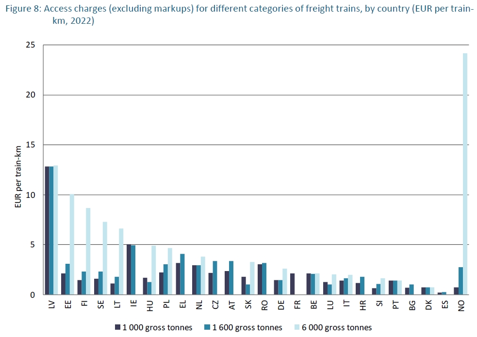«En Alemania, la cuota comparativamente elevada de transporte de mercancías por ferrocarril (y es de los pocos en que ha subido) obedece a la situación central del país y al alto grado de industrialización, pero también a la temprana liberalización del mercado del transporte de mercancías por ferrocarril, a la introducción de un peaje para vehículos pesados en 2005, y a la existencia de un órgano regulador relativamente fuerte e independiente».