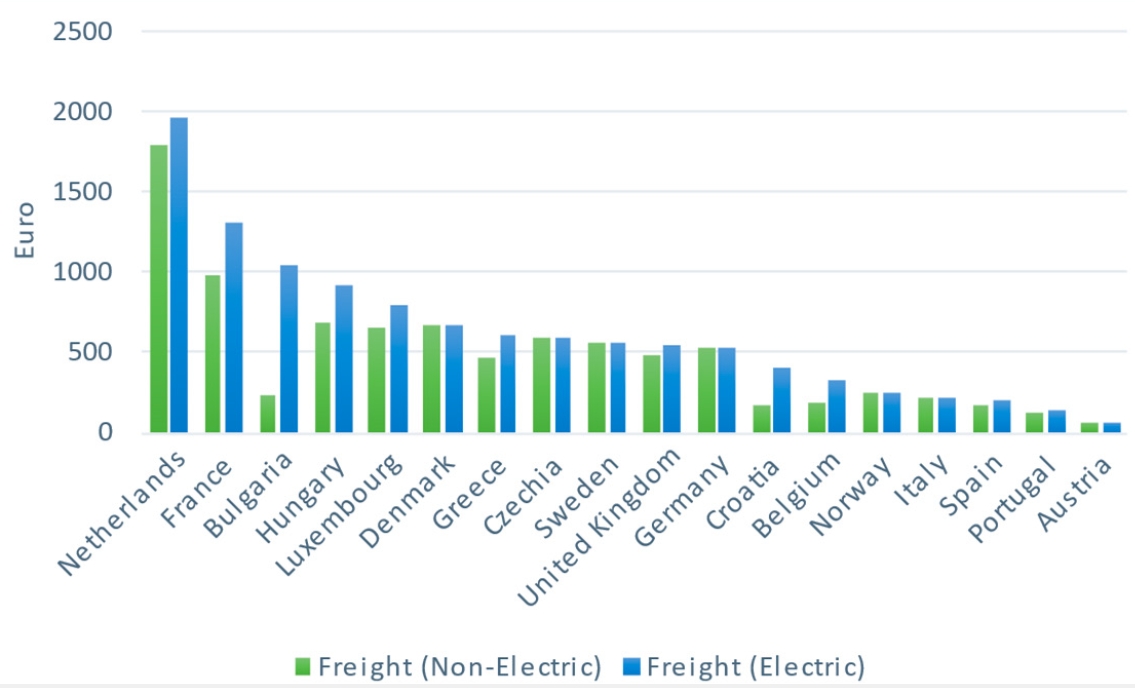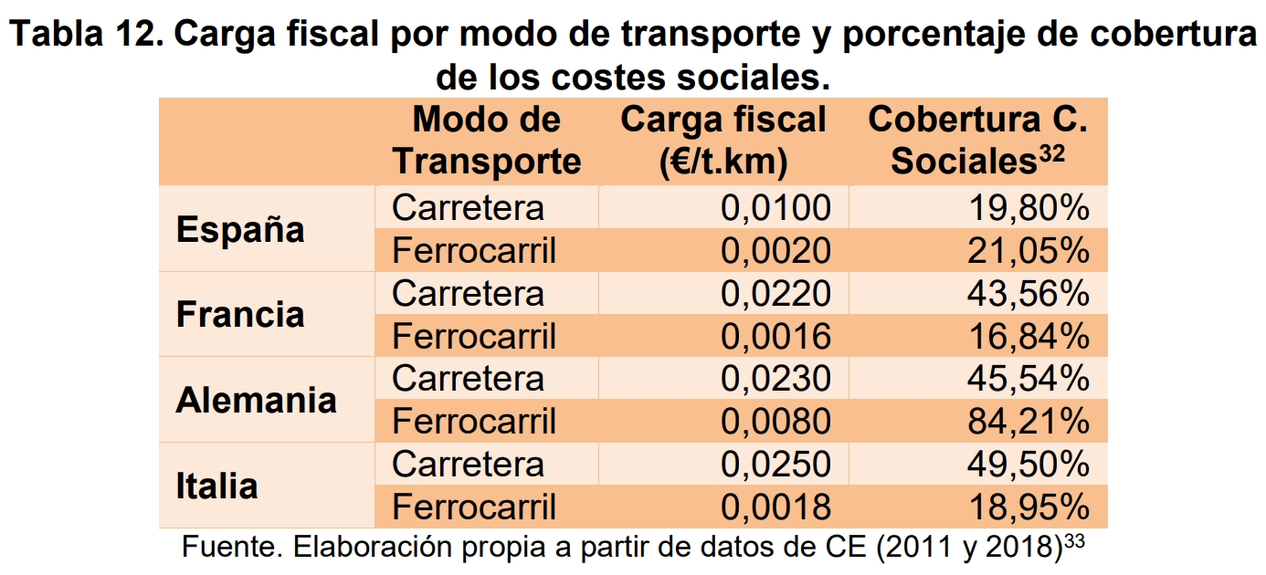 La carga fiscal (la suma de todos los impuestos, tasas y cargos que se asocian directamente a la actividad) del FC en España está en línea con el nivel que afronta en otros países como Francia o Italia. Por el contrario, la de la carretera es la más baja y se encuentra muy alejada de la media comunitaria. Así mismo, el porcentaje de cobertura de los costes sociales en España es mayor en el caso del ferrocarril que en el de la carretera, a diferencia de lo que ocurre en la mayoría de los países estudiados.