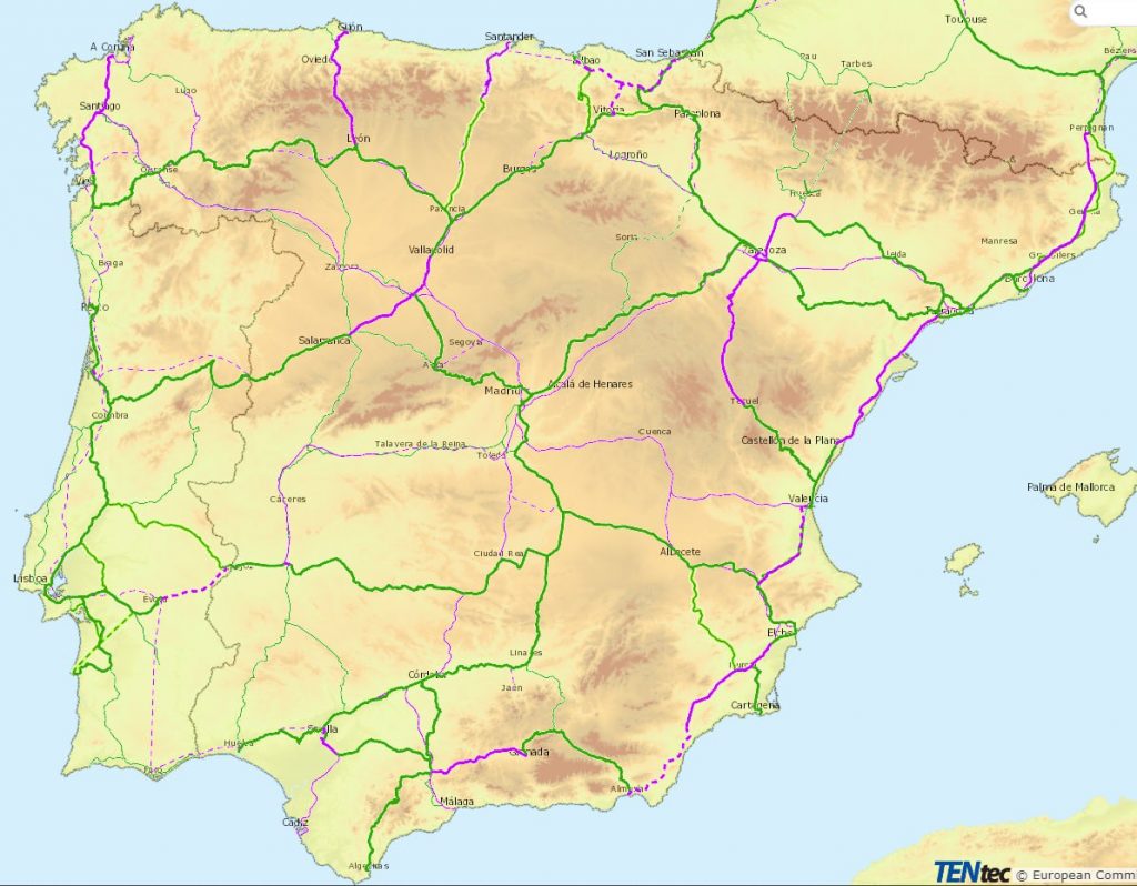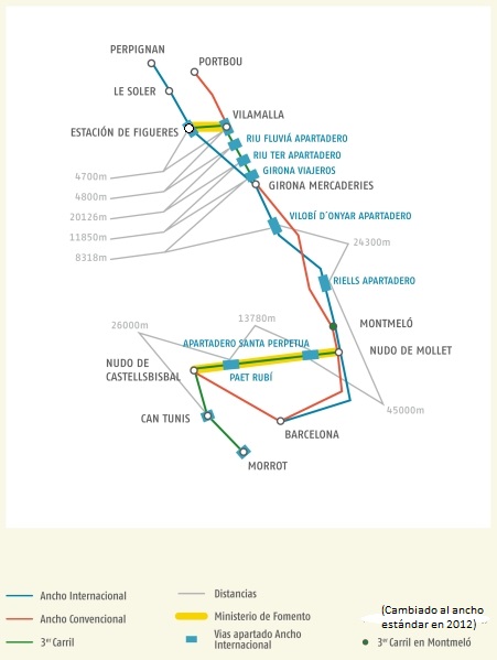 Desde el 21/12/2010 hay ancho estándar (como tal, o mediante ancho mixto) para mercancías desde la frontera (túnel de Perthus, junto a Figueres) hasta el puerto de Barcelona, en 12/2025 llegó hasta Seat y Castellbisbal (bobinas), desde enero llega a La Llagosta, en 2027 llegará hasta Ford y Murcia, a finales de década hasta Almería y -a principios de la próxima- estará desde Irun hasta Júndiz (Álava, dentro de algunos meses hasta Pasajes, Guipúzcoa).