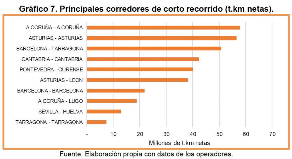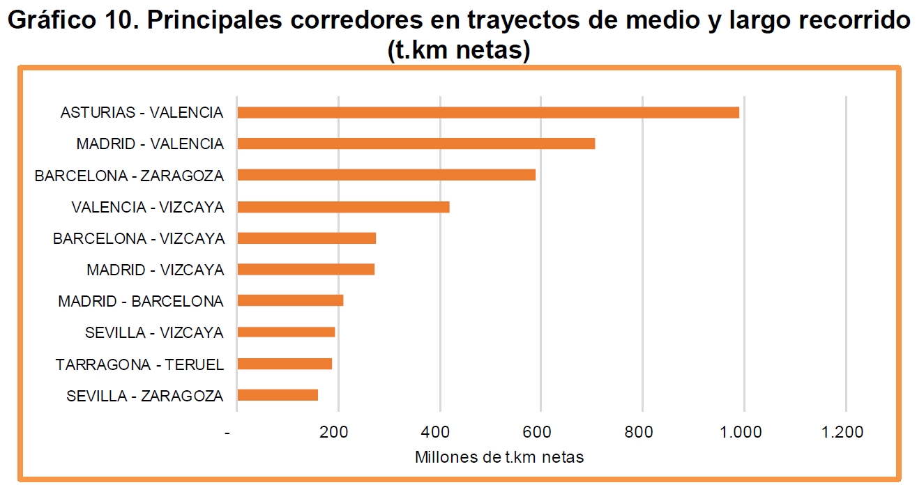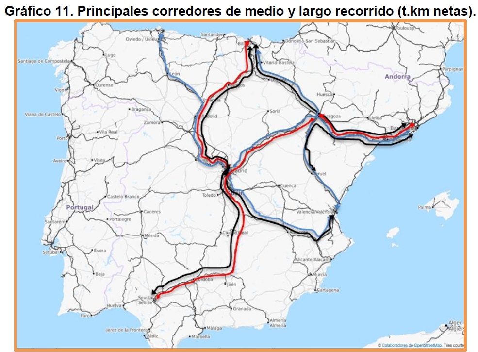 (*) Para conocer el tráfico real, es mucho más indicativo el dato de las toneladas.kilómetro (t.km, número de toneladas multiplicado por la distancia recorrida) que el del número de toneladas (sin más), ya que no puede computar igual (coste, necesidades logísticas, reducción del tráfico de camiones y de gases de efecto invernadero…) un envío dentro de una ciudad que al otro extremo de la península. El recorrido medio de una tonelada (en 2024) fue de 421 km (OFE).