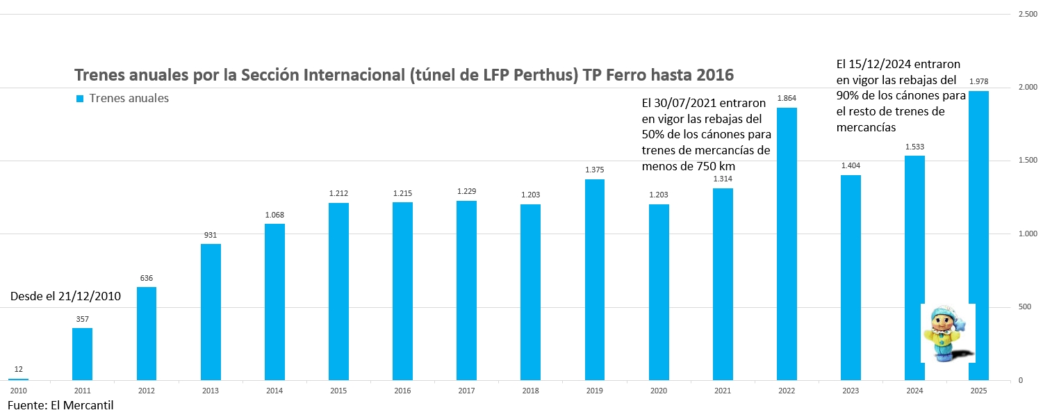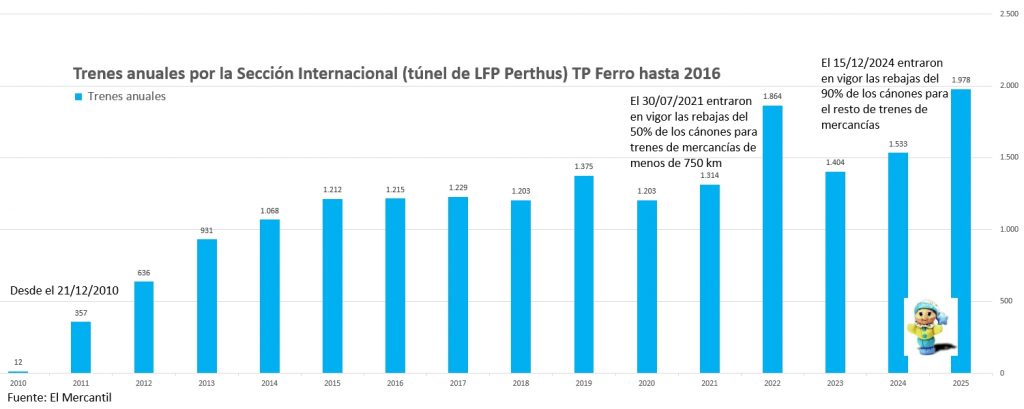Así que (desde el 21/12/2010) existe una línea con el mismo ancho entre el puerto de Barcelona y la frontera francesa (por el túnel de Le Perthus) y con apartaderos para 750 m; aunque tampoco hay muchas mercancías internacionales (no tiene la misma electrificación ni señalización: hay 3 de cada una en los 216 km entre Barcelona y Perpiñán). Sin embargo, la ya mencionada rebaja de hasta el 90% en los cánones de LFP (en 12/2024) sí consiguió aumentar dicho tráfico en un 30%, inicialmente hasta los 43 surcos semanales y a 1.978 trenes en el año 2025 (38 surcos). Aunque en 2022 los trenes (1.864 o 36 surcos semanales) ya habían aumentado un 35% con respecto a 2019 (1.375 trenes o 26 surcos).