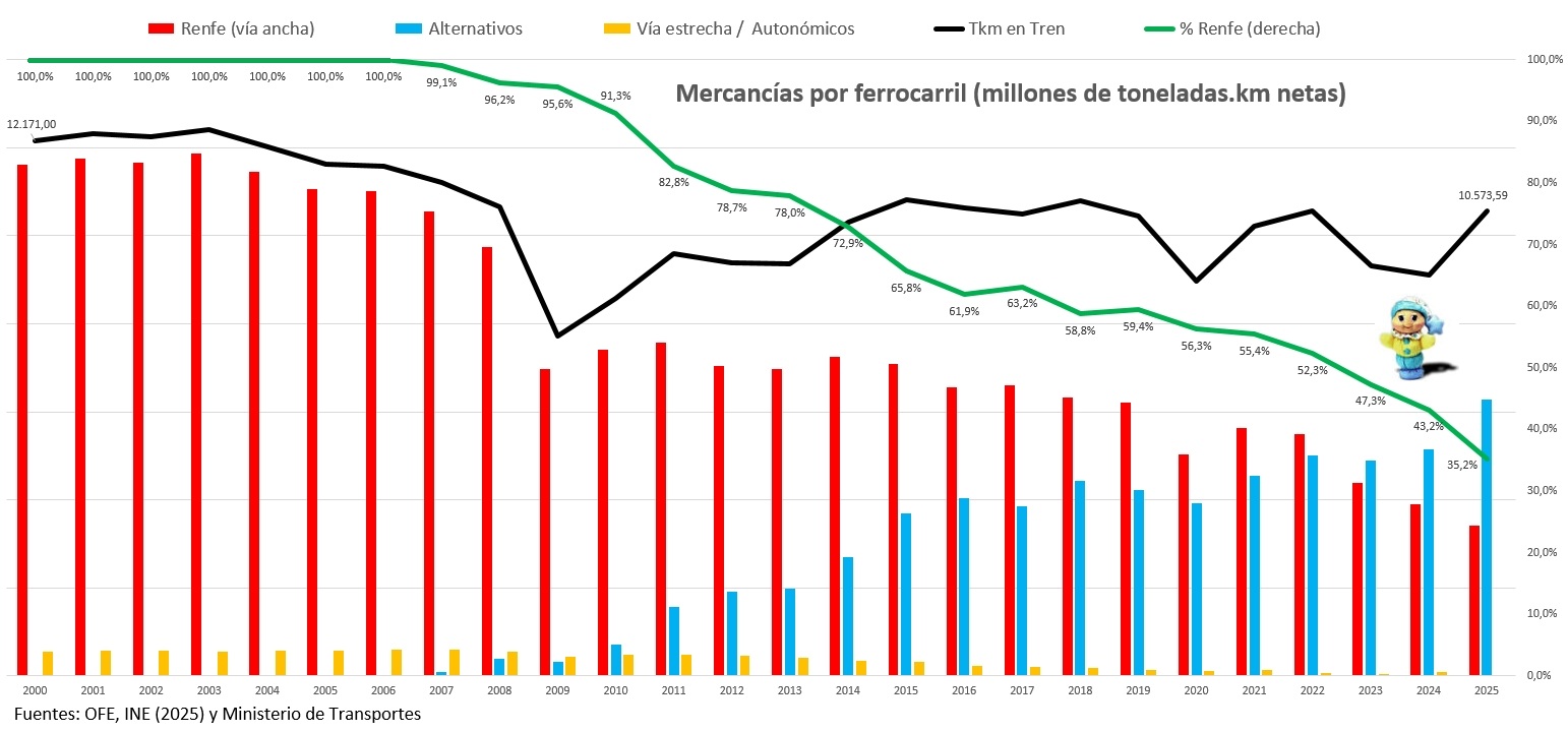 En 2006 (último año sin competencia) Renfe transportó 11.012 millones de t.km (el récord fueron 12.669 en 1974, durante la primera crisis del petróleo y sin autovías), mientras que en 2025 fueron 3.403 (-69%) que, sumadas a las 6.268 transportadas por los operadores alternativos (53,56% del total), nos lleva a un total de 9.671 (-12% sobre 2006 y -24% sobre el récord de 1974). Es decir: los operadores privados han conseguido los mejores contratos de Renfe a costa de bajar el tráfico total (Renfe abandona sus tráficos más onerosos ante la pérdida de los más rentables) y, por tanto, de rebajar aun más el reparto modal con la carretera, pasando del 5,0% en 2006 al 3,7% en 2025 (ver más abajo, en «reparto modal»).