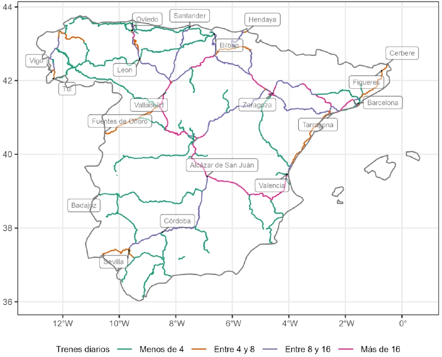 También ha bajado el número medio de trenes, que pasó de 428 diarios solo de Renfe en 2007 (y 367 en total en 2015) a 287 en total en 2024 (277 de ellos sobre vía ancha y 162 de ellos de Renfe, OFE).