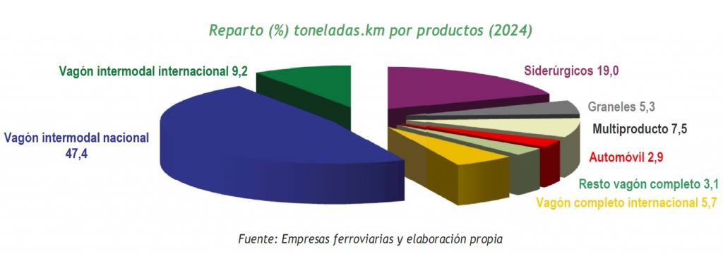 En cuanto a los tipos de transporte, entre 2015 y 2024 (OFE), con una bajada media del 16%, ha subido el tráfico intermodal (contenedores, un 17%) y bajó el vagón completo (especializados para cada mercancía, -38%) y -entre estos- los que menos han bajado han sido siderúrgicos (-25%) y automoción (-33%), y los que más: graneles (-48%) y multiproducto (-66%). El tráfico intermodal fue el 57% del total en 2024 (CNMC).