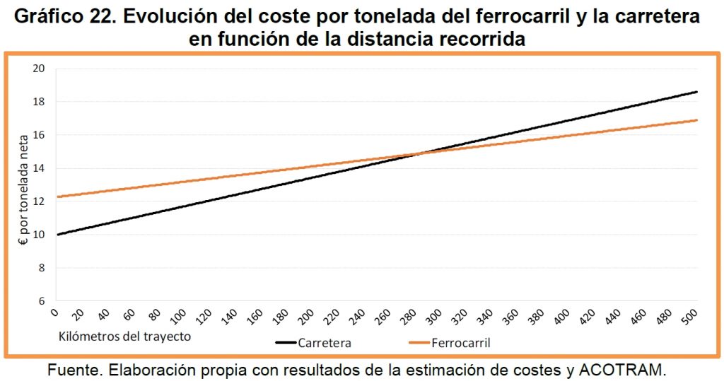 Las economías de escala del ferrocarril (el mayor tamaño de la carga, que permite un ahorro del 45% en el consumo energético por unidad), solo son significativas en largas distancias debido a los elevados costes fijos. Pero, en Alemania, el 80% del transporte de mercancías por carretera se realiza en un radio de 150 km, el 18% entre 151 y 500 km, y solo el 3% más allá«. Y eso que el coste del modo ferroviario está calculado bajo el supuesto de tren completo y de aprovechamiento máximo de la capacidad de carga, lo que excluye a un número importante de cargadores (CNMC 2017).