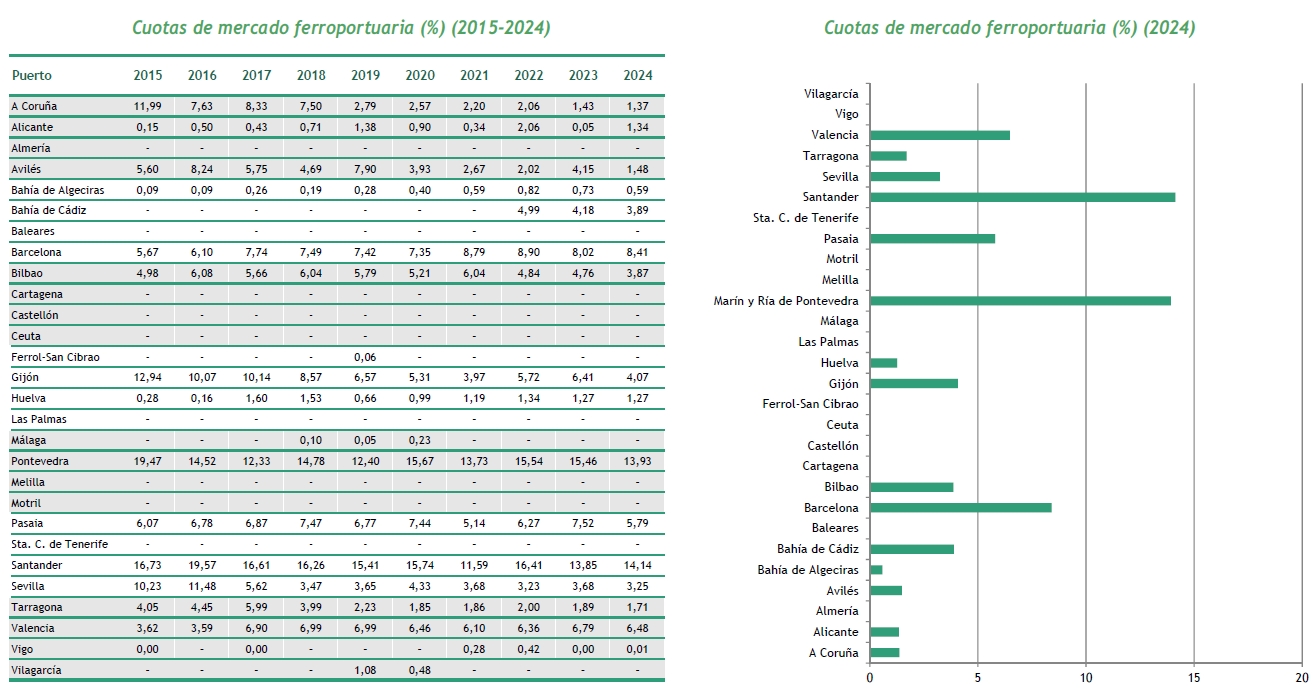 En la red de Adif hay (desde 2006 hasta 2024) 62 nuevos apartaderos particulares de empresas, que suelen ser grandes. En cuanto a las instalaciones logísticas, en el año 2024 había 220, cifra que permanece constante desde 2020 (OFE, había 91 en 2015).