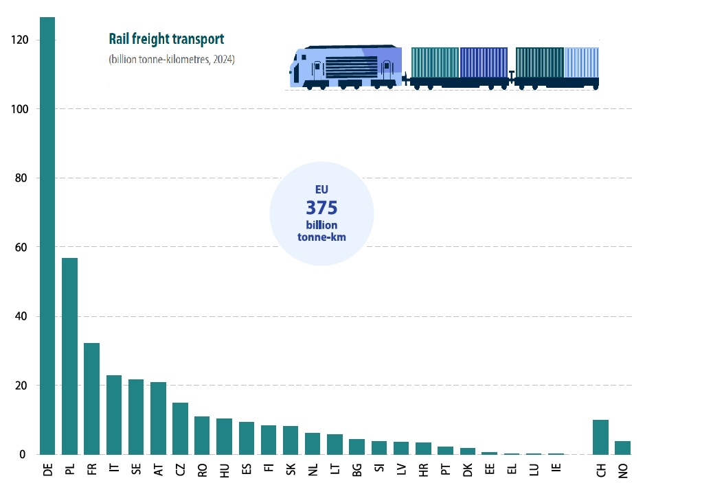 Obviamente, los países de tránsito con mucho tráfico internacional (Suiza, Austria, Alemania, Polonia, Hungría o Eslovaquia) tienen mayores recorridos medios de la mercancía, lo que favorece al ferrocarril; también Suecia, Finlandia, Estonia, Letonia y Lituania (imagino que será por el clima). Por ejemplo, en Italia el transporte internacional representa el 62,3% de la carga transportada por ferrocarril, gracias al comercio desde el norte del país (que supone el 56,4% del PIB italiano) con Francia y Alemania, entre otros. En la UE, el 81% de los viajes de mercancías multimodales son transfronterizos.